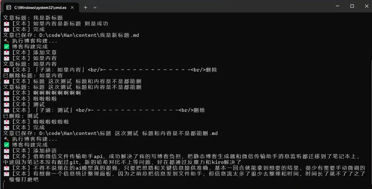 借助微信文件传输助手api,成功解决了我的写博客负担,把静态博客生成器和微信传输助手消息监听都迁移到了笔记本上,中途因为笔记本没有配过git,新的哈希对比不上等问题,好在都通过反重力和kiro解决了